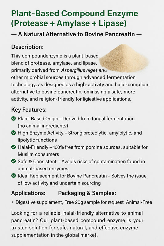 El nuestroComplejo multienzimáticoEsta mezcla, cuidadosamente diseñada, contiene una mezcla de enzimas de origen vegetal y no animal para las industrias que buscan reemplazar las enzimas tradicionales.proteasa, amilasa y lipasa de alta actividad, desarrollado a travésFermentación no transgénicael usoAspergillus nigery otras cepas microbianas seguras.